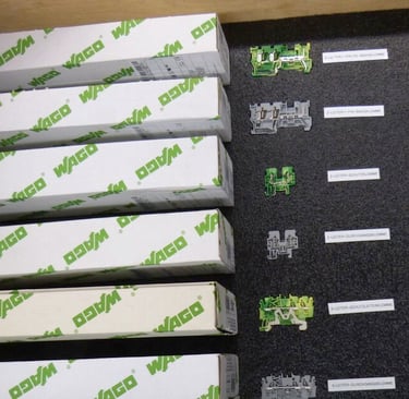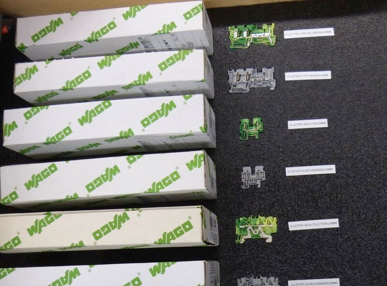 Das gezeigte Bild ist ein praktisches Beispiel für visuelles Management, da es eine strukturierte Anordnung von Materialien (WAGO-Klemmen) mit Beschriftungen zeigt. Dies erleichtert die Identifikation und Entnahme der richtigen Komponenten, minimiert Fehler und steigert die Effizienz.