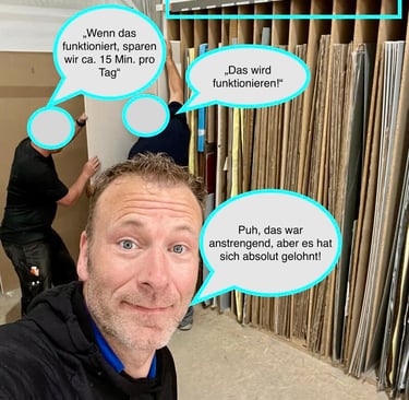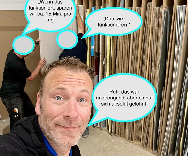Im Arbeitsalltag zeigte sich schnell, dass diese Sortierung für die tatsächlichen Abläufe ungeeignet war. Die Mitarbeitenden mussten flexibel reagieren, Aufträge wechselten, Formate variierten. Also wurden Bleche irgendwann einfach dort abgelegt, wo gerade Platz war. Die ursprüngliche Struktur war damit faktisch außer Kraft gesetzt. Zurück blieb ein Regal ohne klare Logik – und tägliches Suchen.